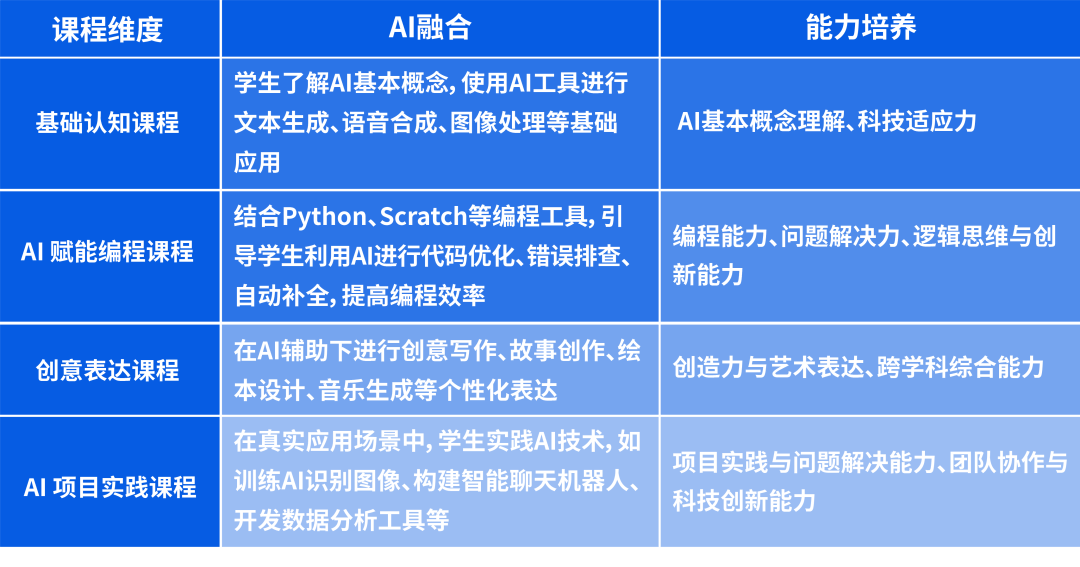 正在课程设想上,成长为及格的人工智能时代。为全面推进教育现代化贡献力量。AI东西让进修体例愈加多元,帮帮学生走出讲堂,依托浙江、上海等地多年人工智能课程研发堆集取讲授实践?